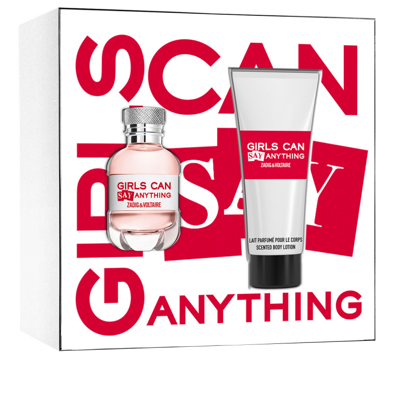 مجموعة هدايا "زاديج أند فولتير جيرلز كان ساي إني ثينج" (Zadig & Voltaire Girls Can Say Anything) تحتوي على زجاجة من عطر أو دو برفيوم بحجم 50 مل وأنبوب من لوشن الجسم بحجم 100 مل. هذه المجموعة المثالية تقدم تجربة عطرية متكاملة للمرأة العصرية.